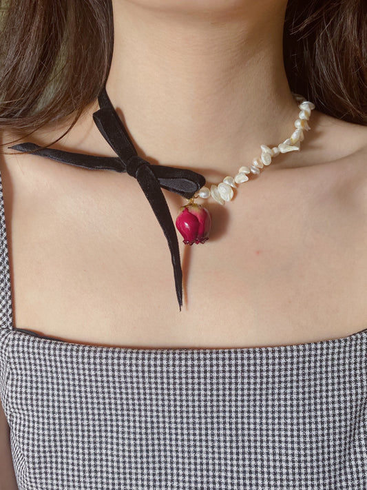 Hydrangeas Garden Bow Tie Pearl Necklace