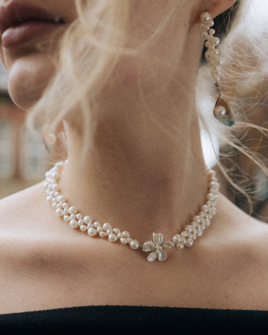 White Pearl Flower Dewdrop Double Strand Necklace №67