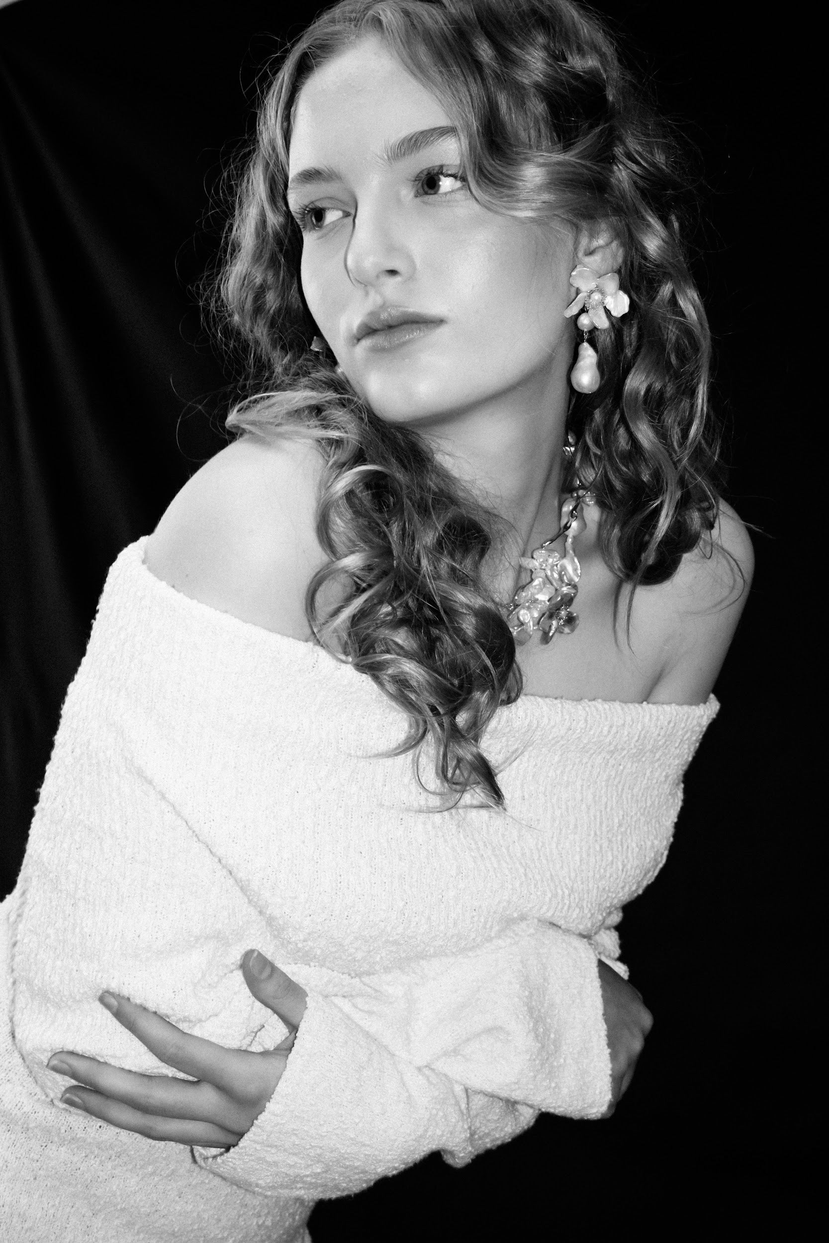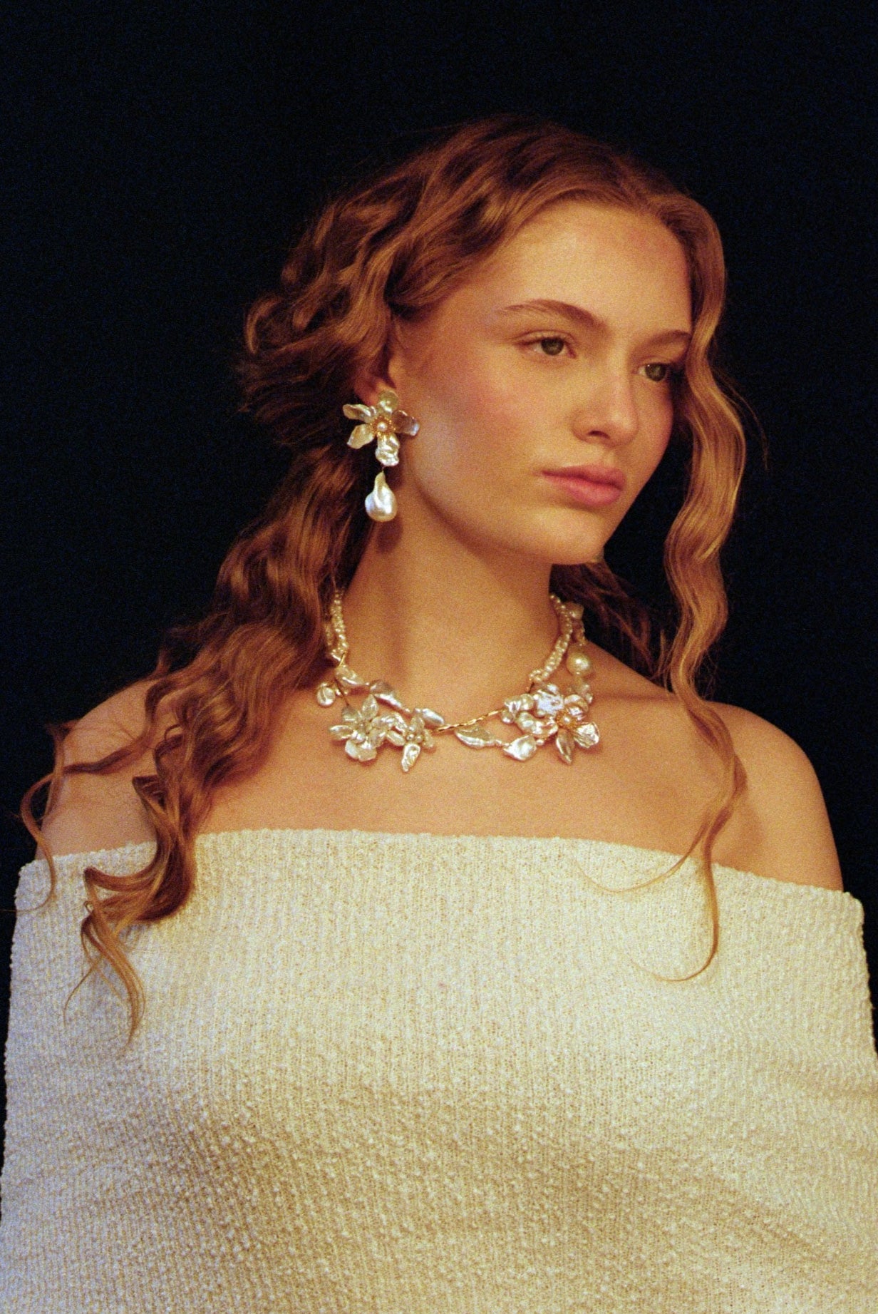 These earrings feature delicate keshi pearl flowers paired with stunning baroque pearls, each radiating a soft metallic glow with subtle pink undertones. The organic shapes of the baroque pearls add uniqueness to every piece, while the luminous petals of the pearl flowers evoke timeless sophistication.
