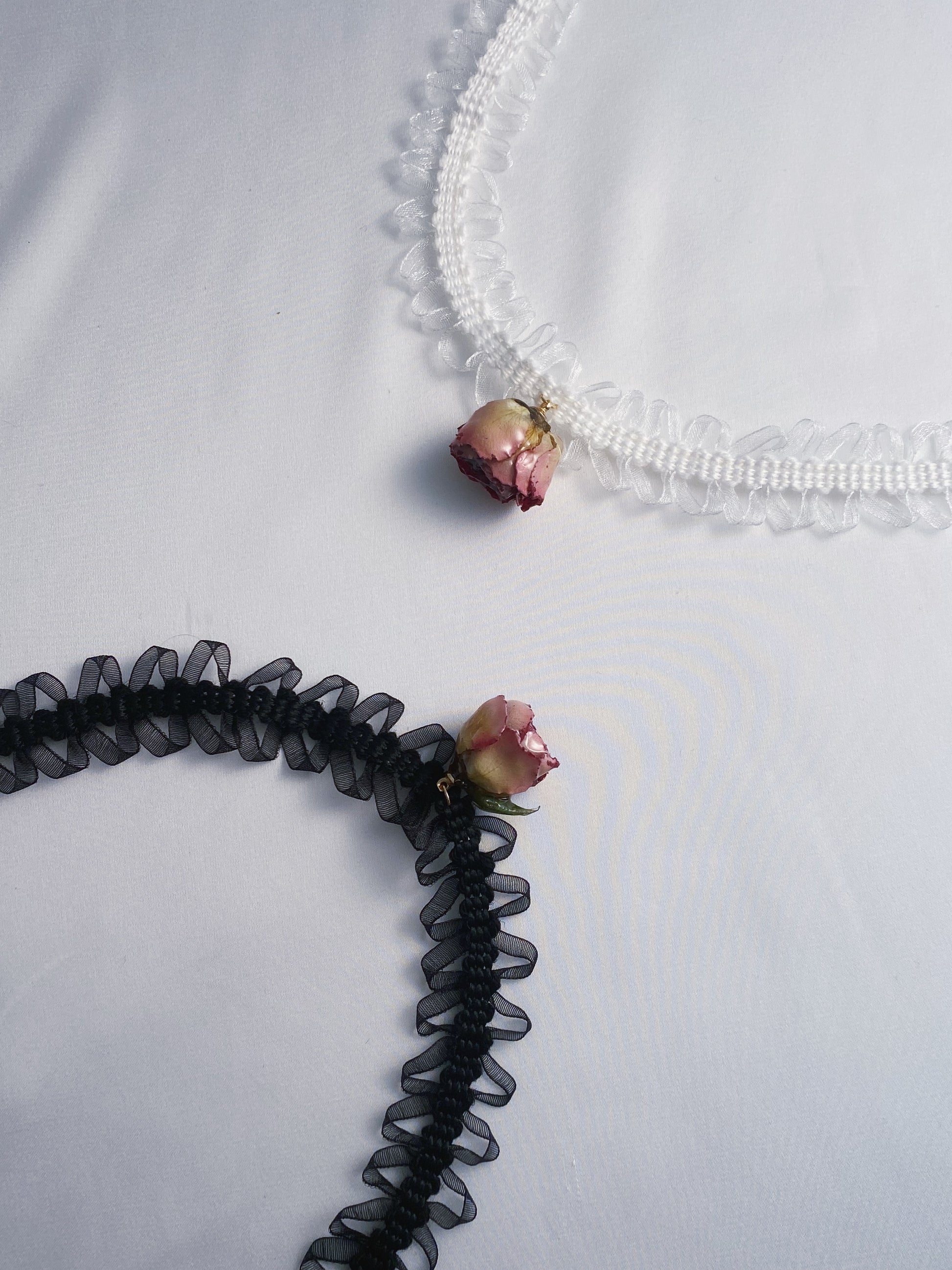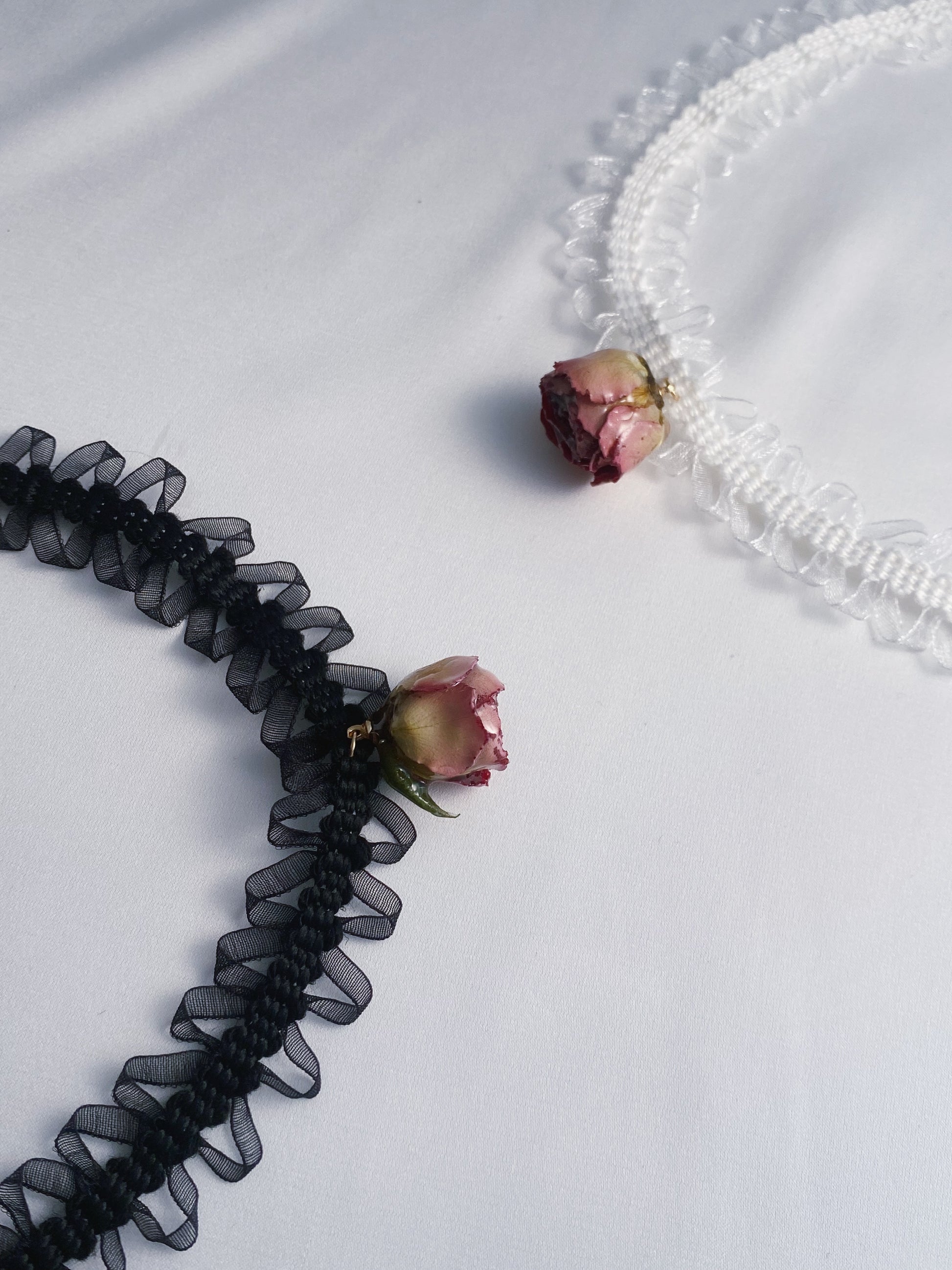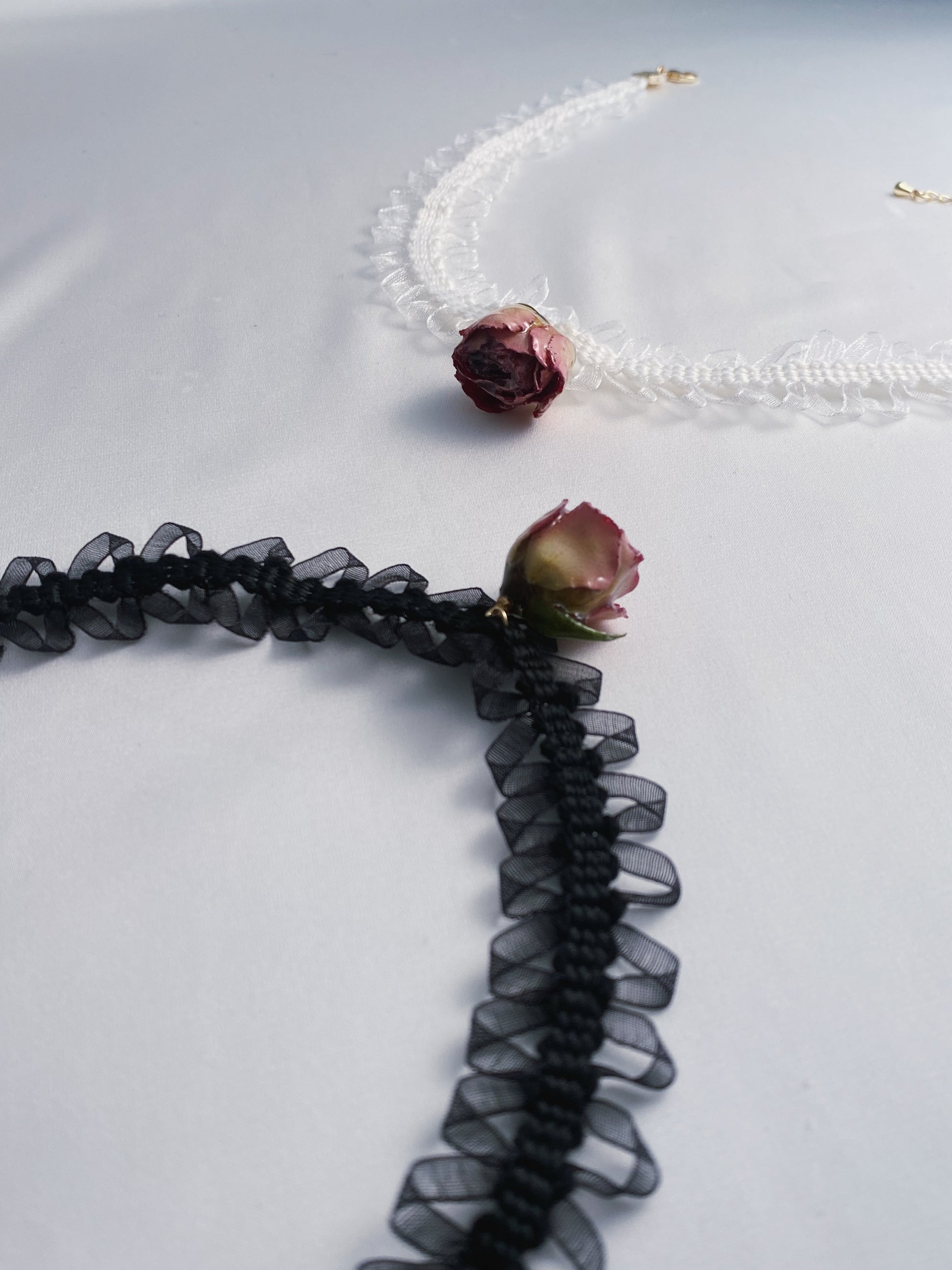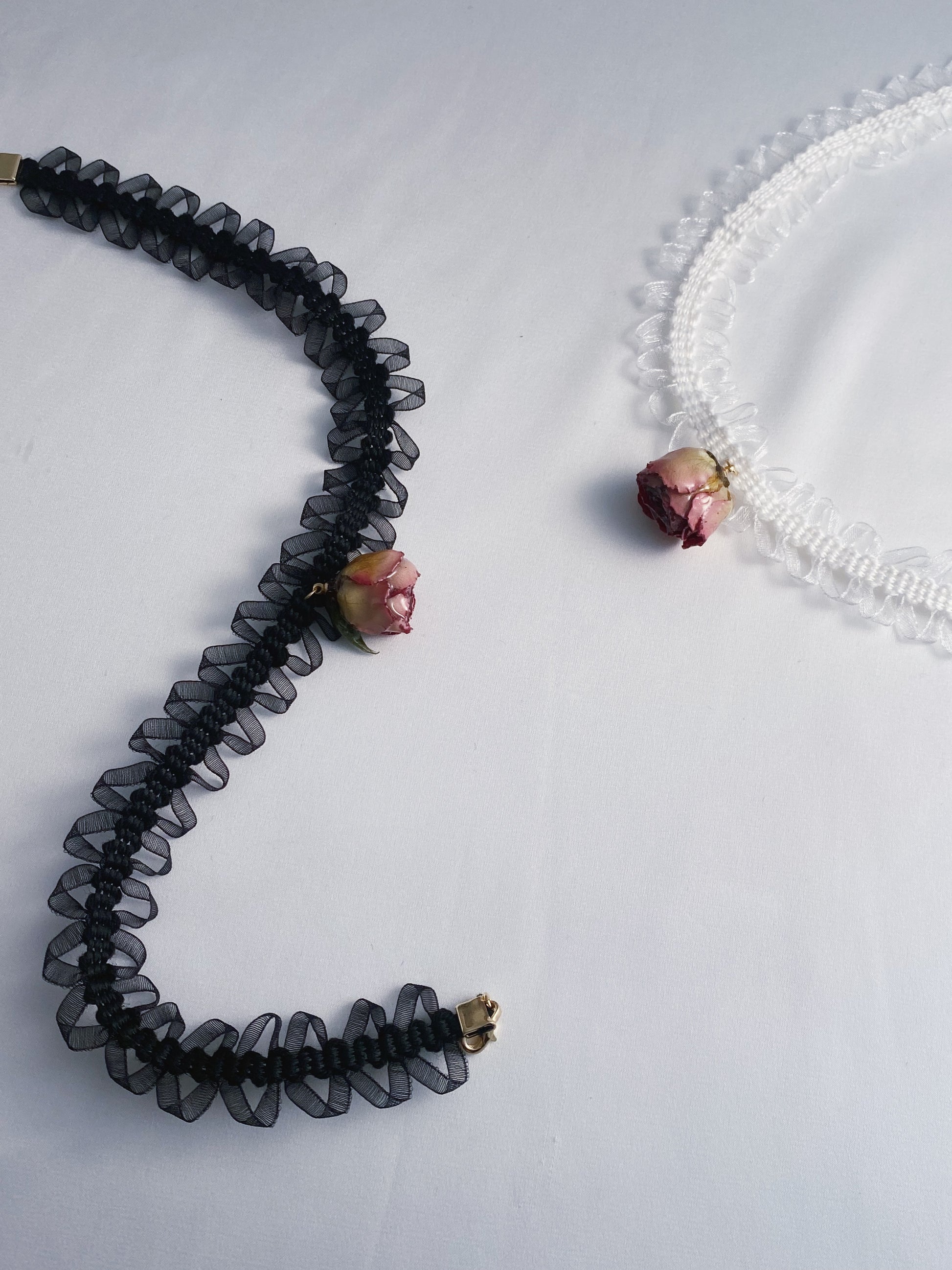 A captivating blend of timeless elegance, ballet-inspired grace, and the poetic charm of roses. Designed to evoke the beauty of a dancer in motion, this choker features intricate white or black lace, delicately layered to mimic the ethereal swirl of a ballerina’s pirouette.