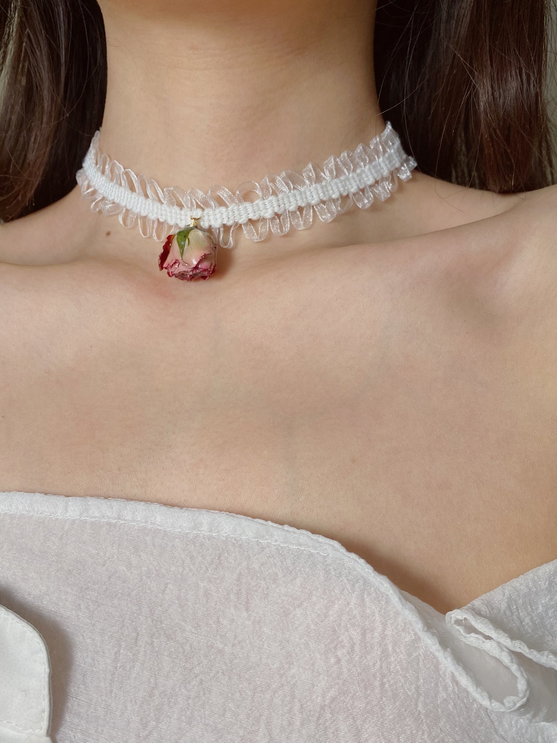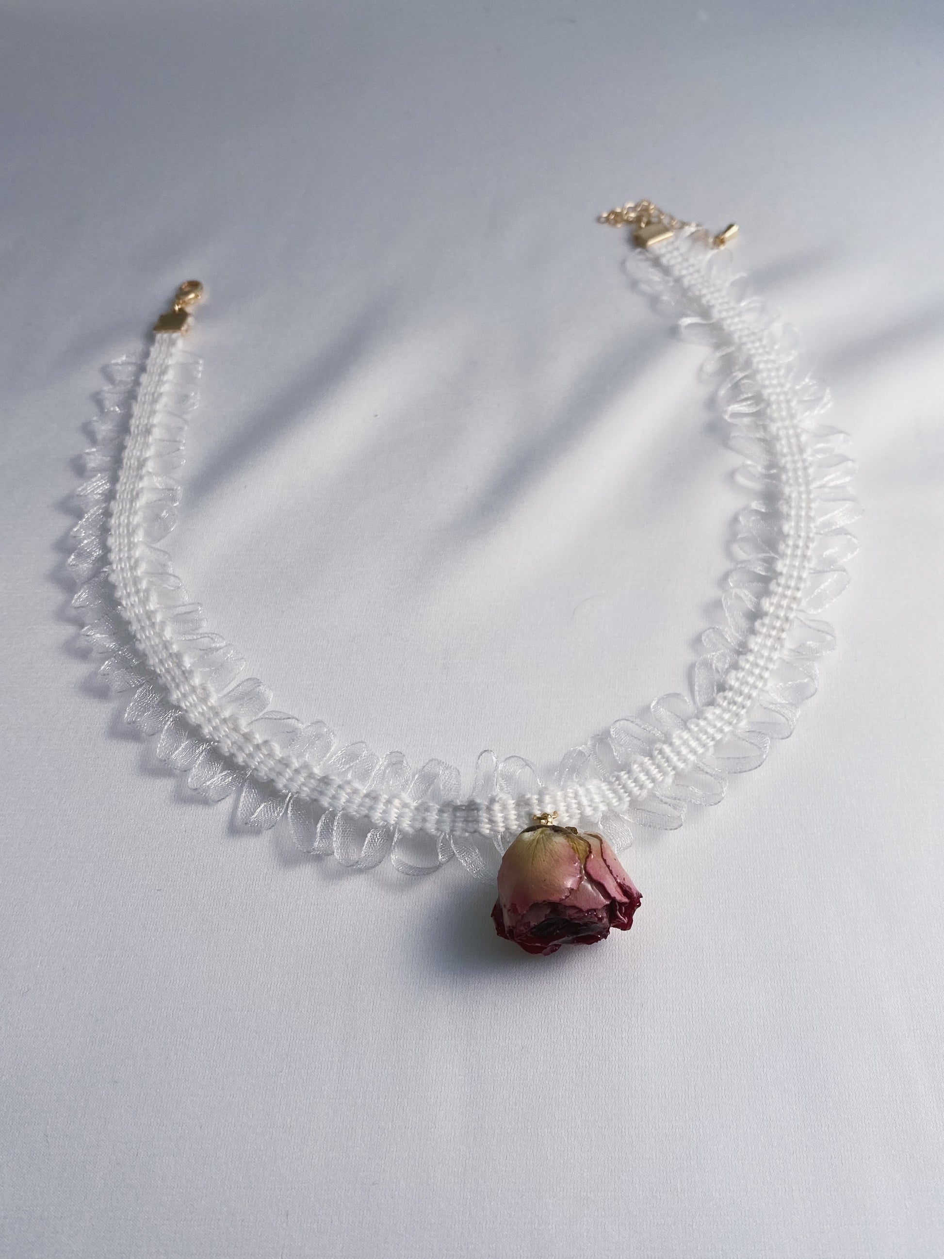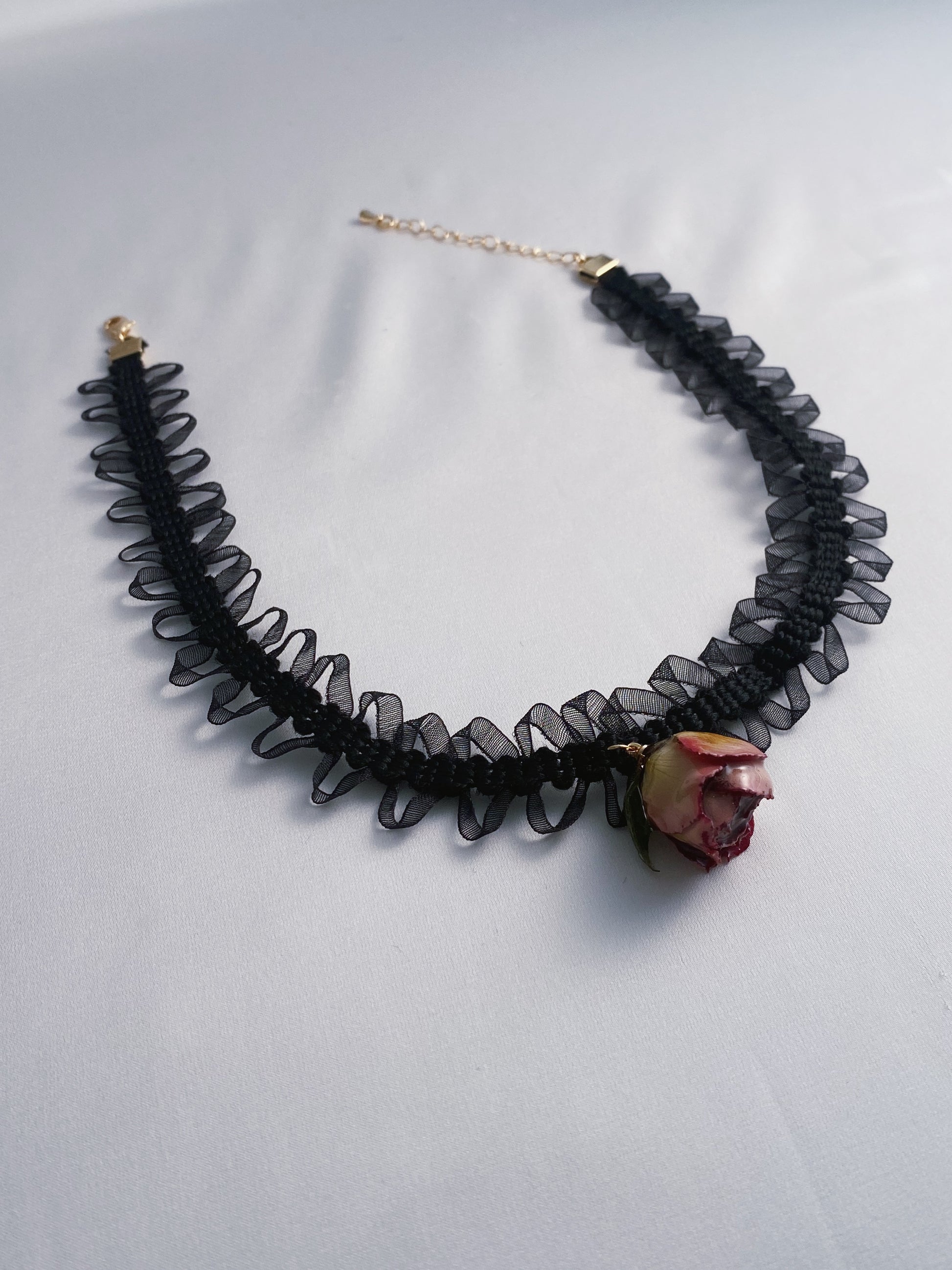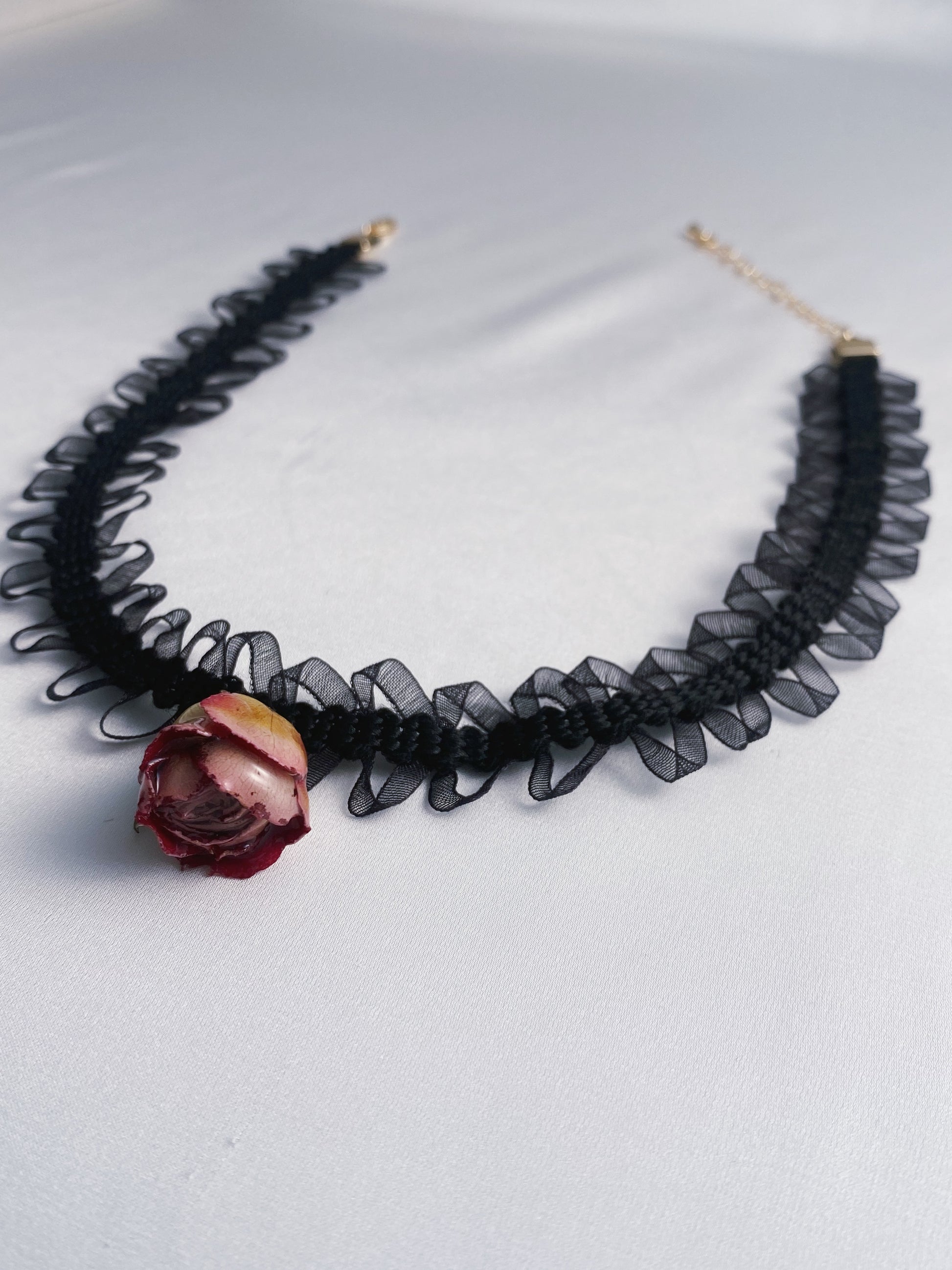 A captivating blend of timeless elegance, ballet-inspired grace, and the poetic charm of roses. Designed to evoke the beauty of a dancer in motion, this choker features intricate white or black lace, delicately layered to mimic the ethereal swirl of a ballerina’s pirouette.