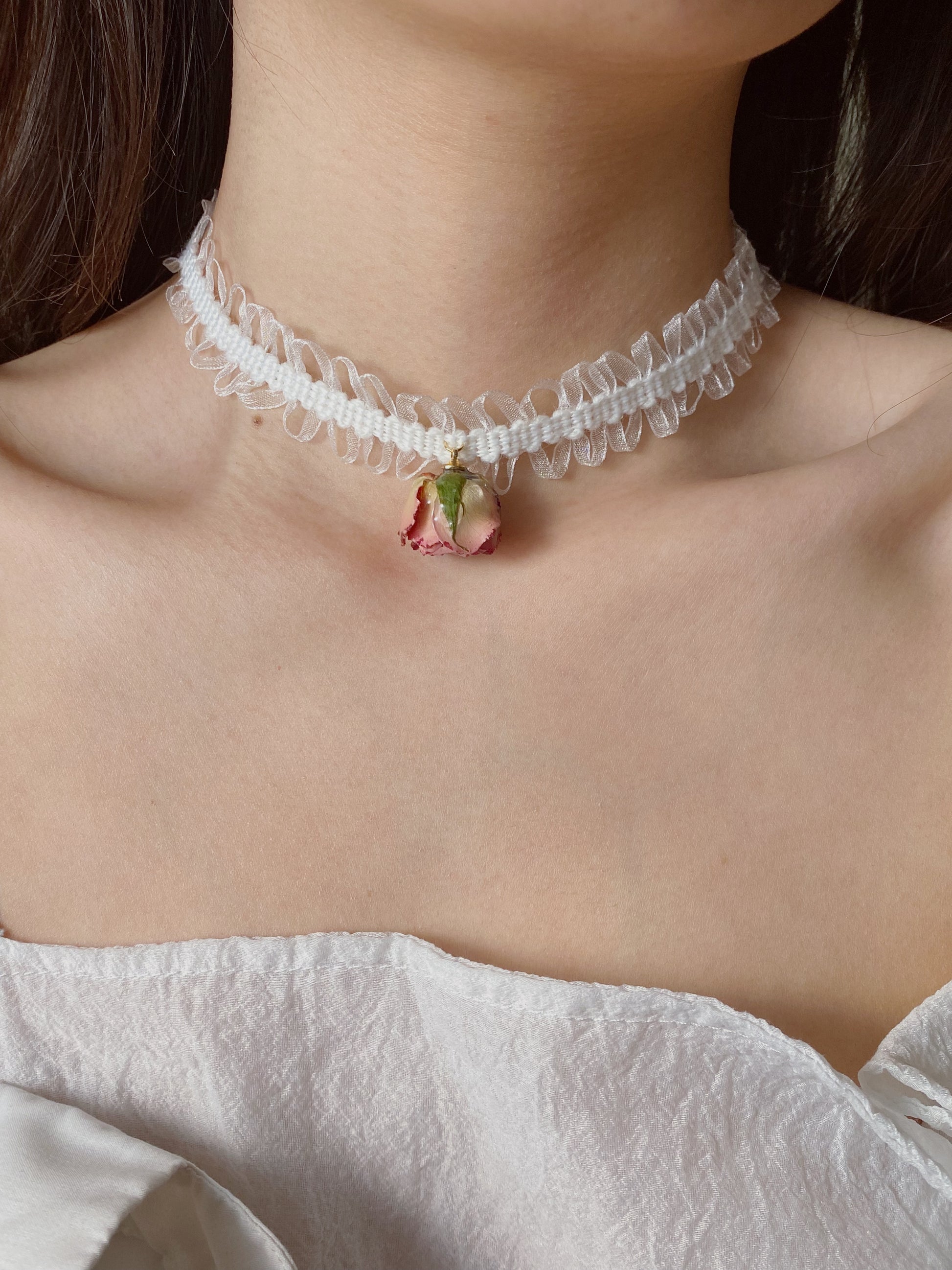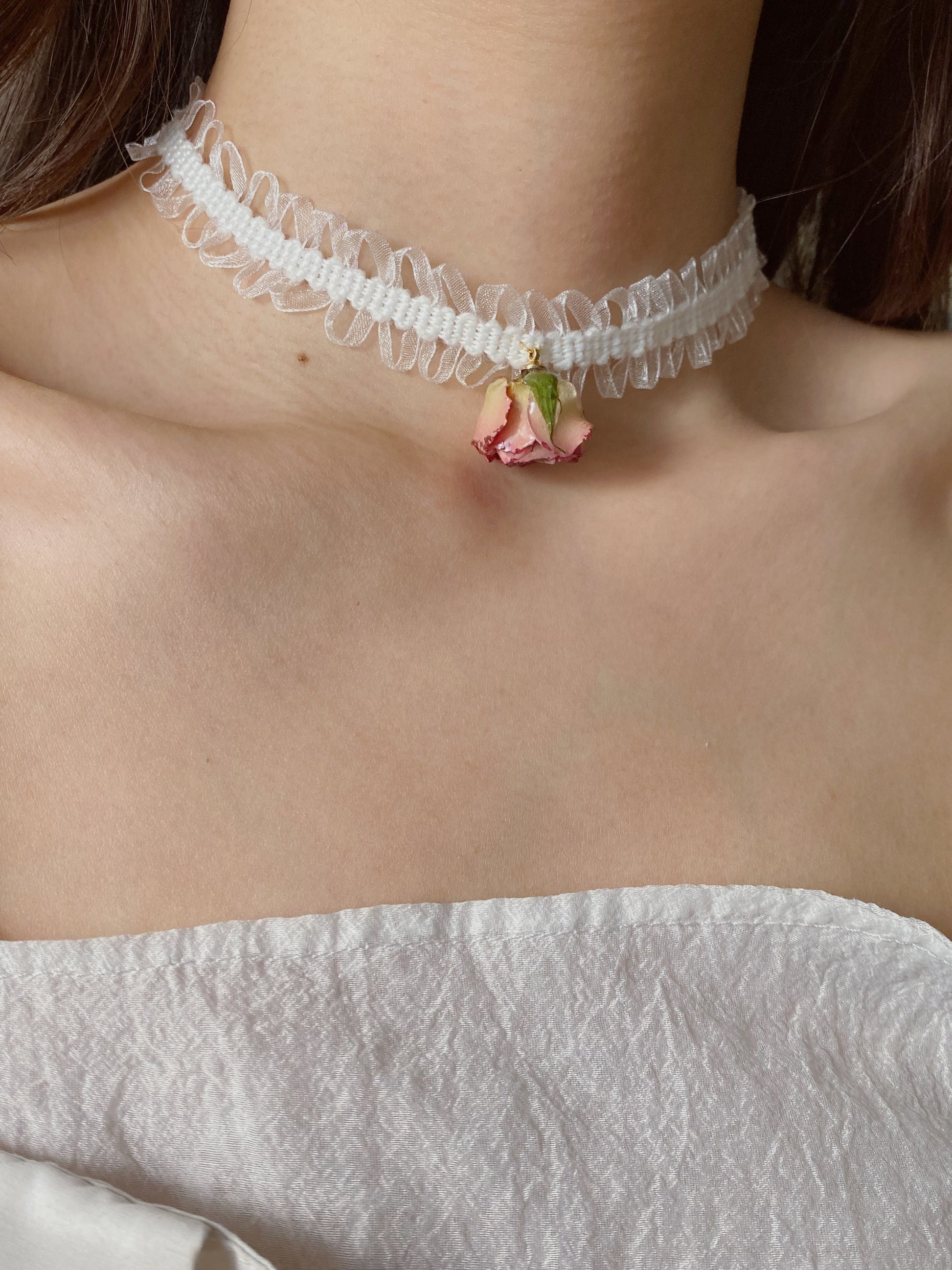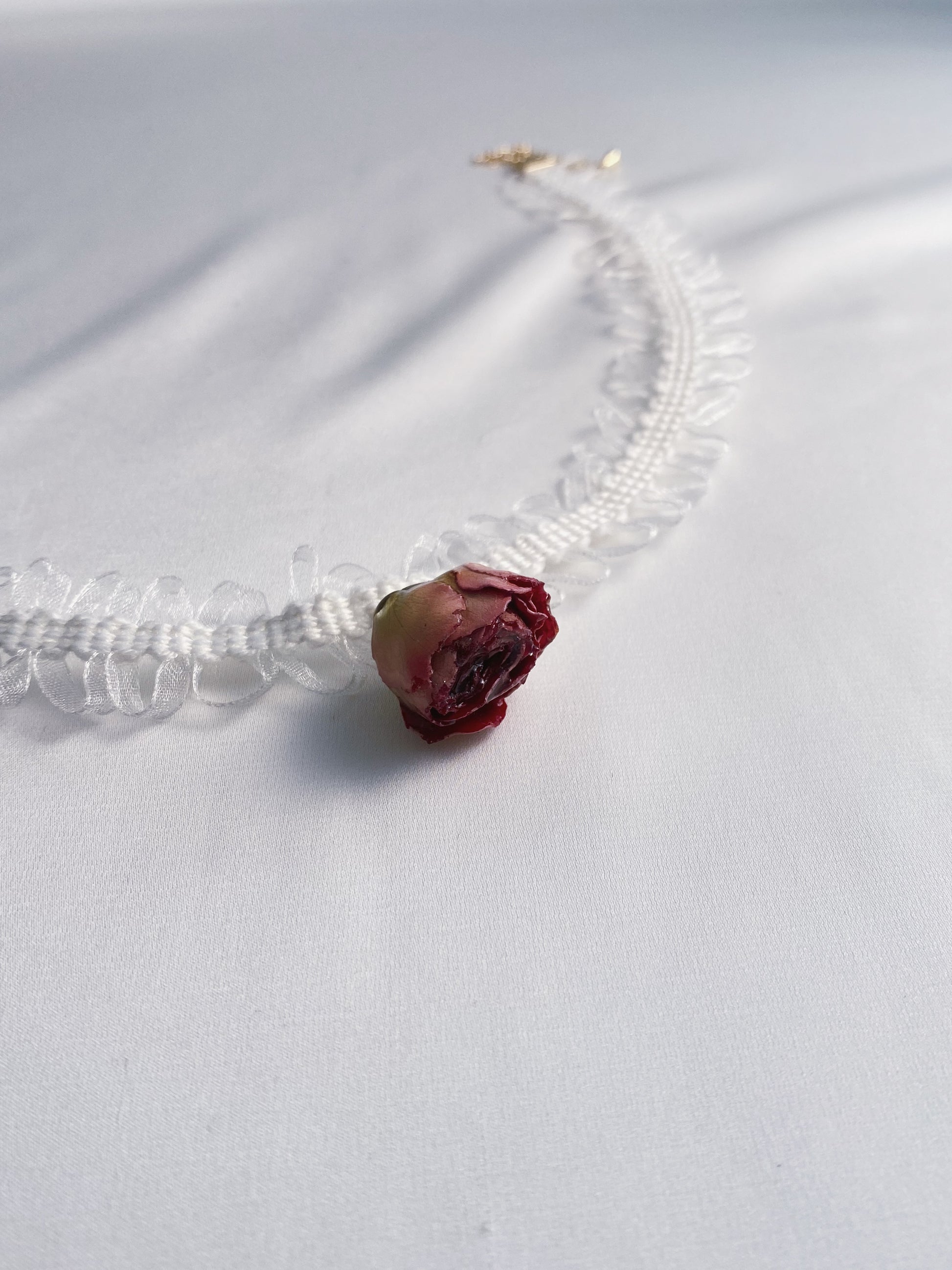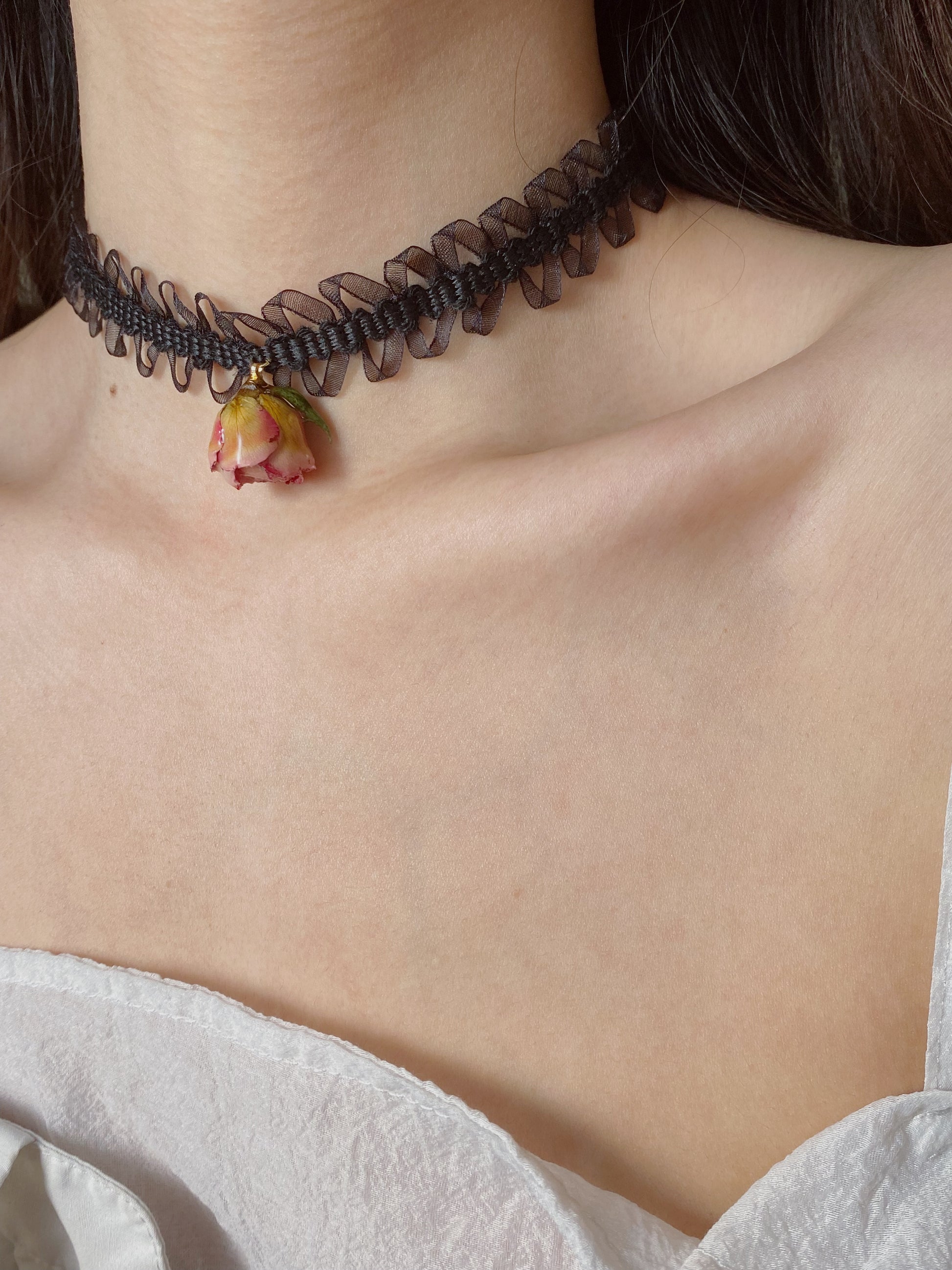 A captivating blend of timeless elegance, ballet-inspired grace, and the poetic charm of roses. Designed to evoke the beauty of a dancer in motion, this choker features intricate white or black lace, delicately layered to mimic the ethereal swirl of a ballerina’s pirouette.