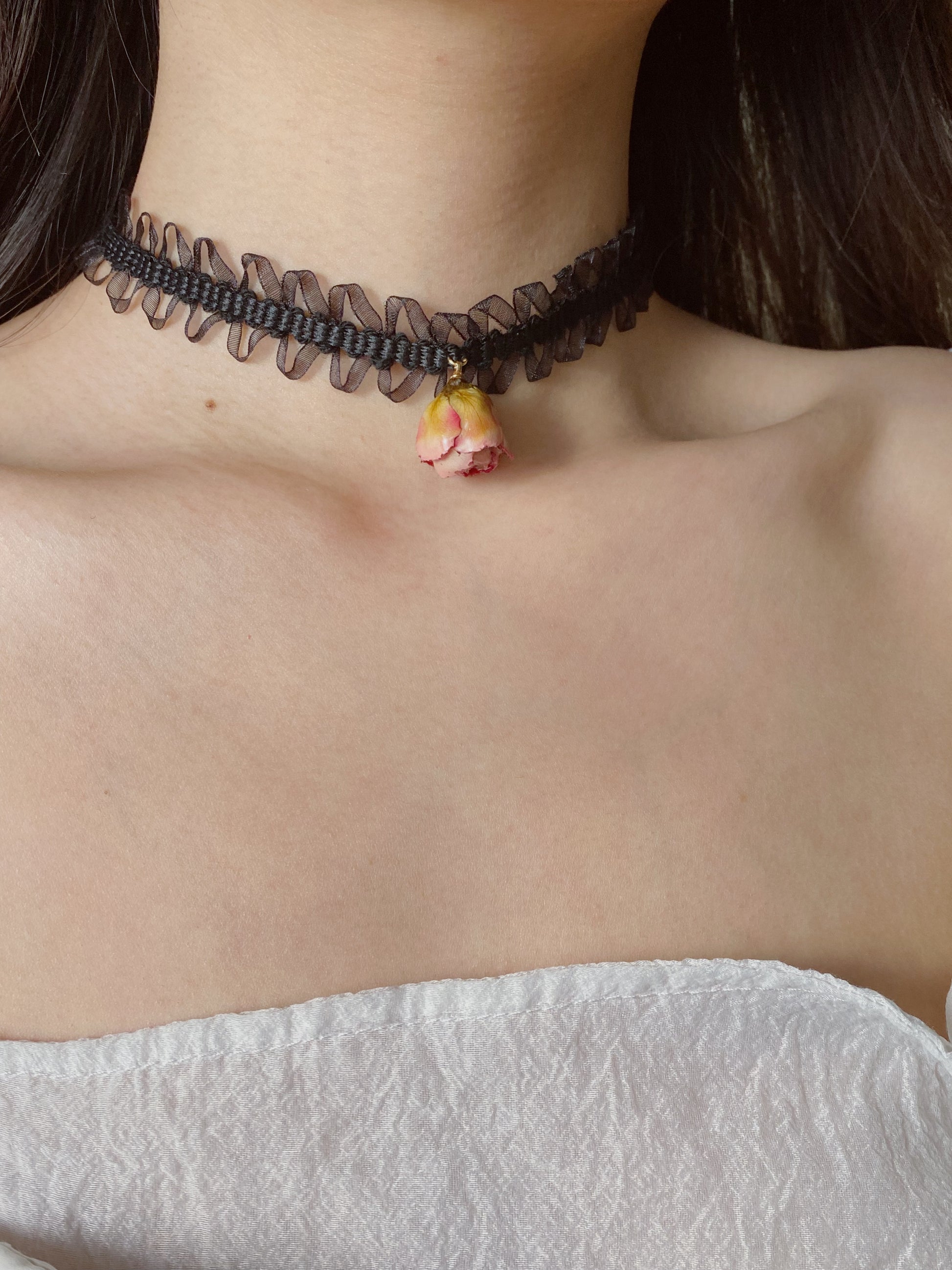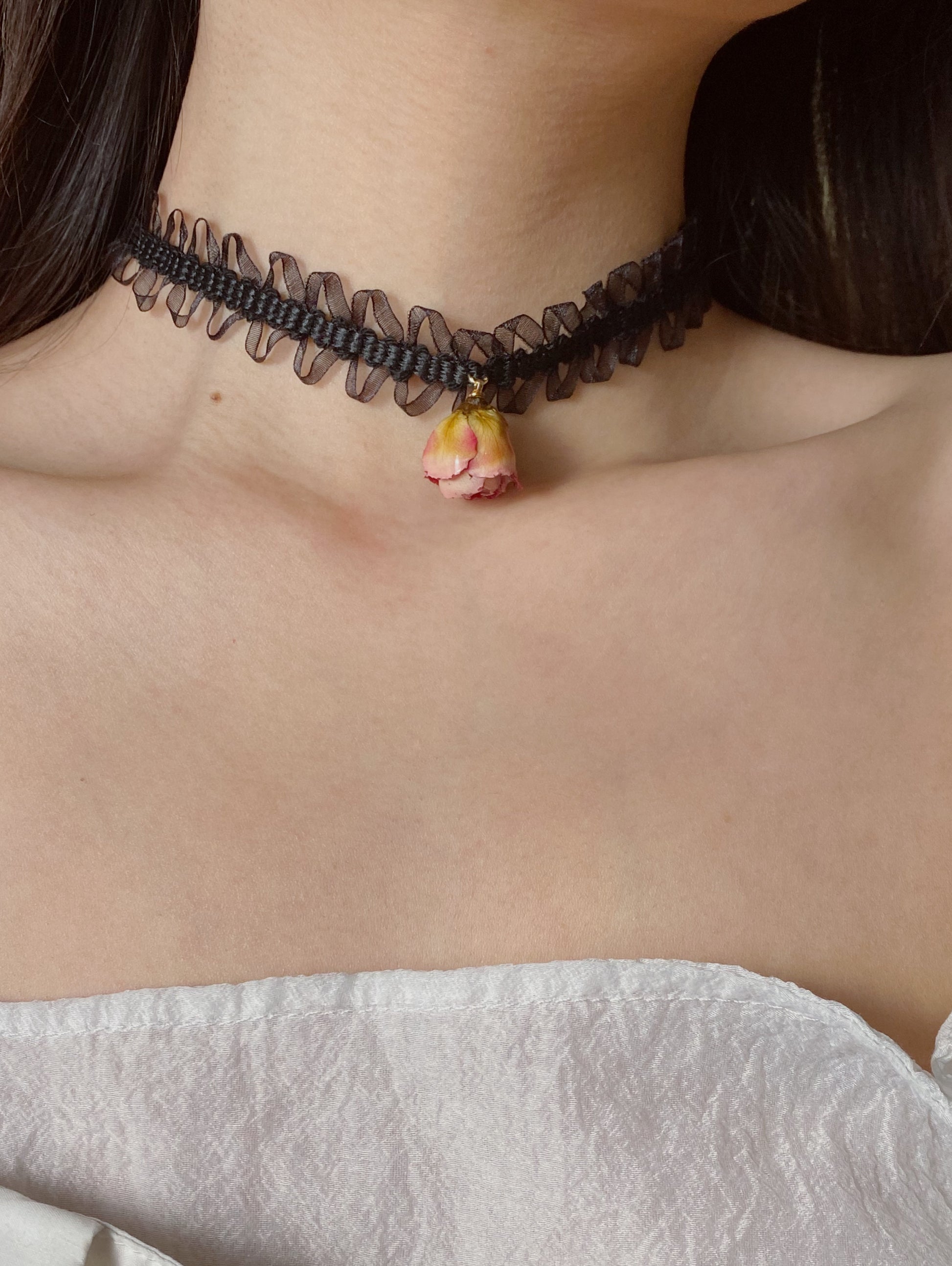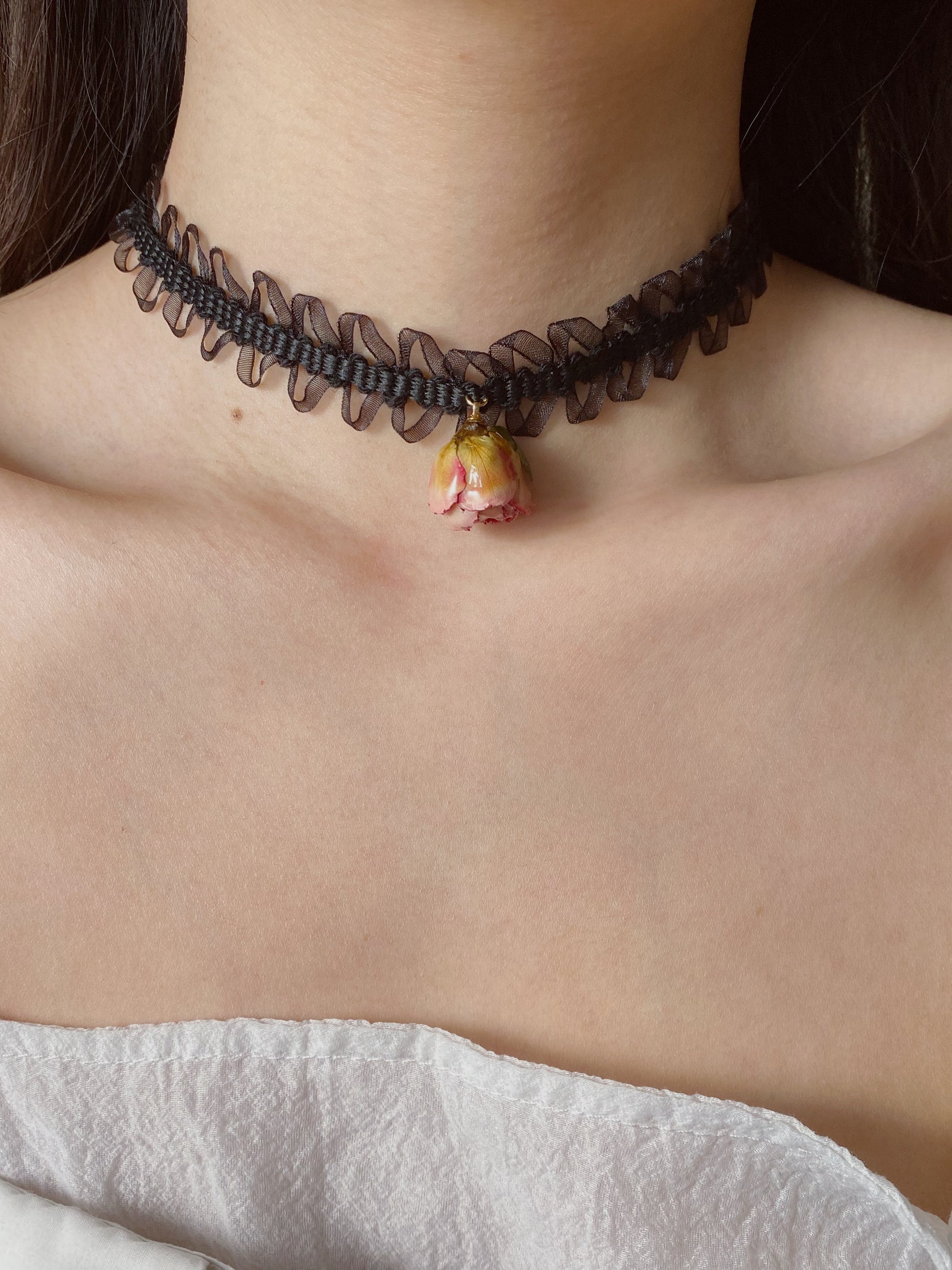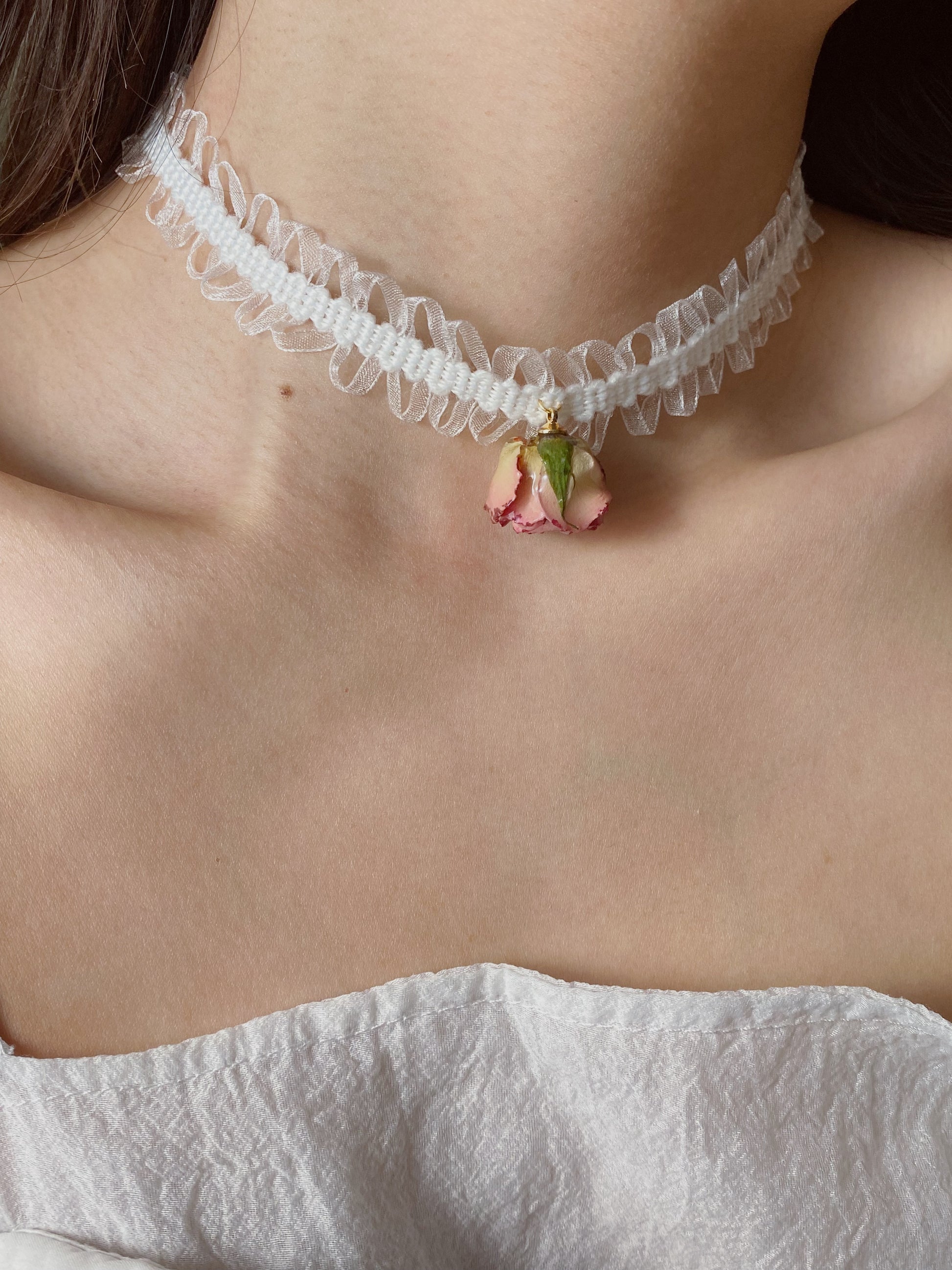 A captivating blend of timeless elegance, ballet-inspired grace, and the poetic charm of roses. Designed to evoke the beauty of a dancer in motion, this choker features intricate white or black lace, delicately layered to mimic the ethereal swirl of a ballerina’s pirouette.