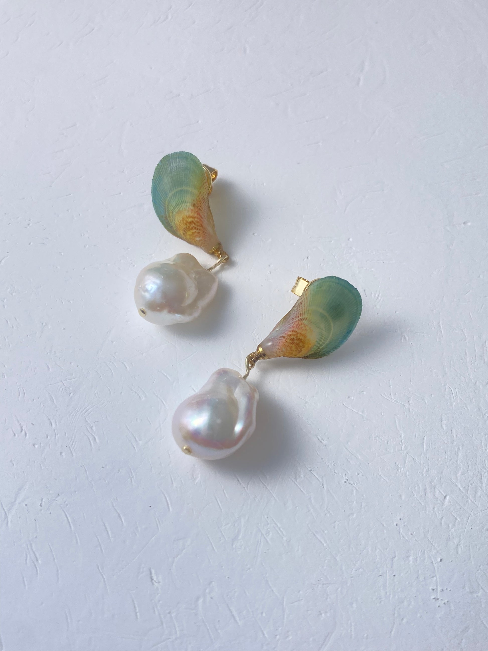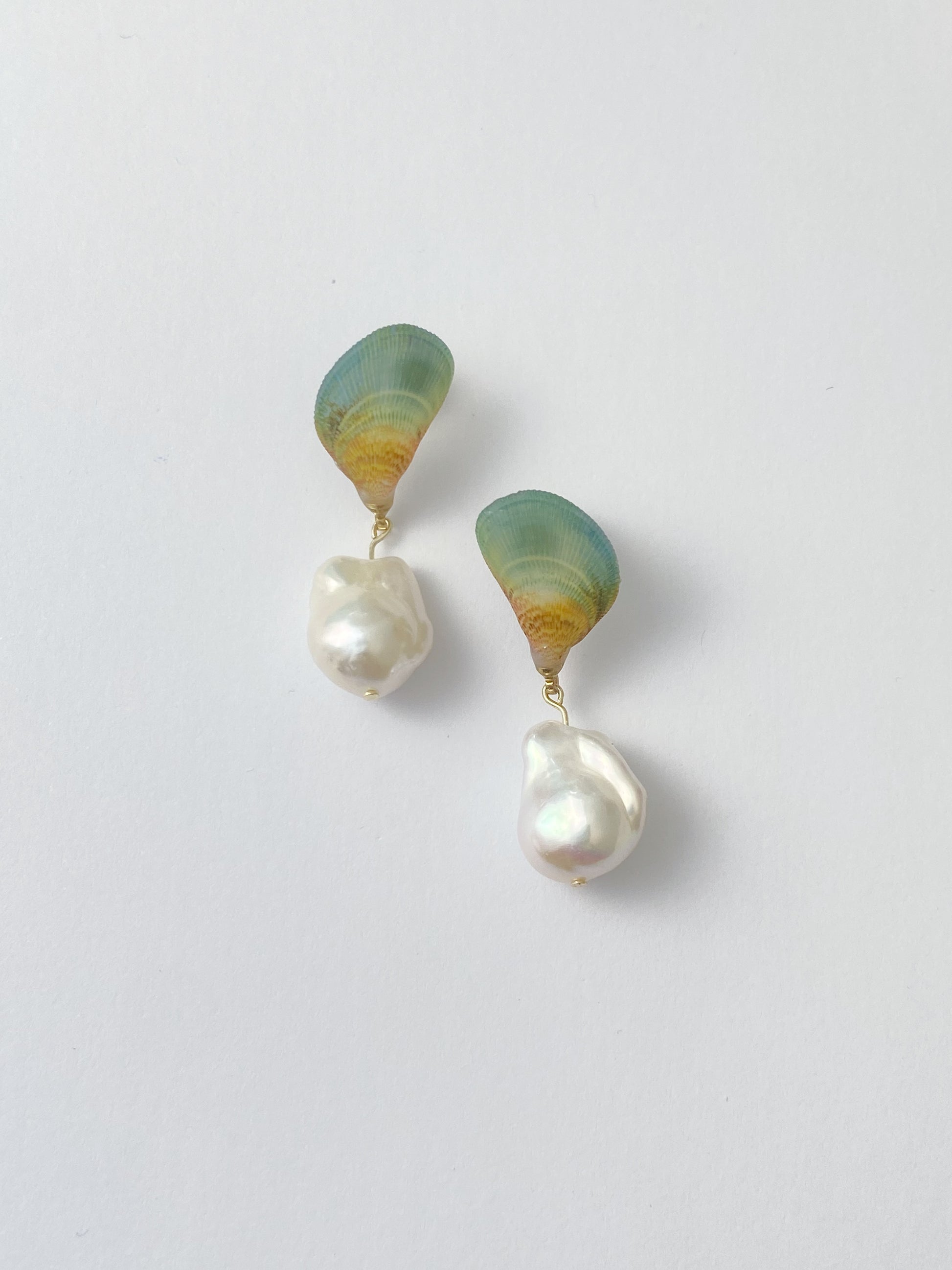 Each shell is paired with a luminous baroque freshwater pearl, creating a harmonious blend of ocean’s natural artistry and timeless elegance. No two earrings are ever alike, the colours and markings of every shell tell their own story of the sea.