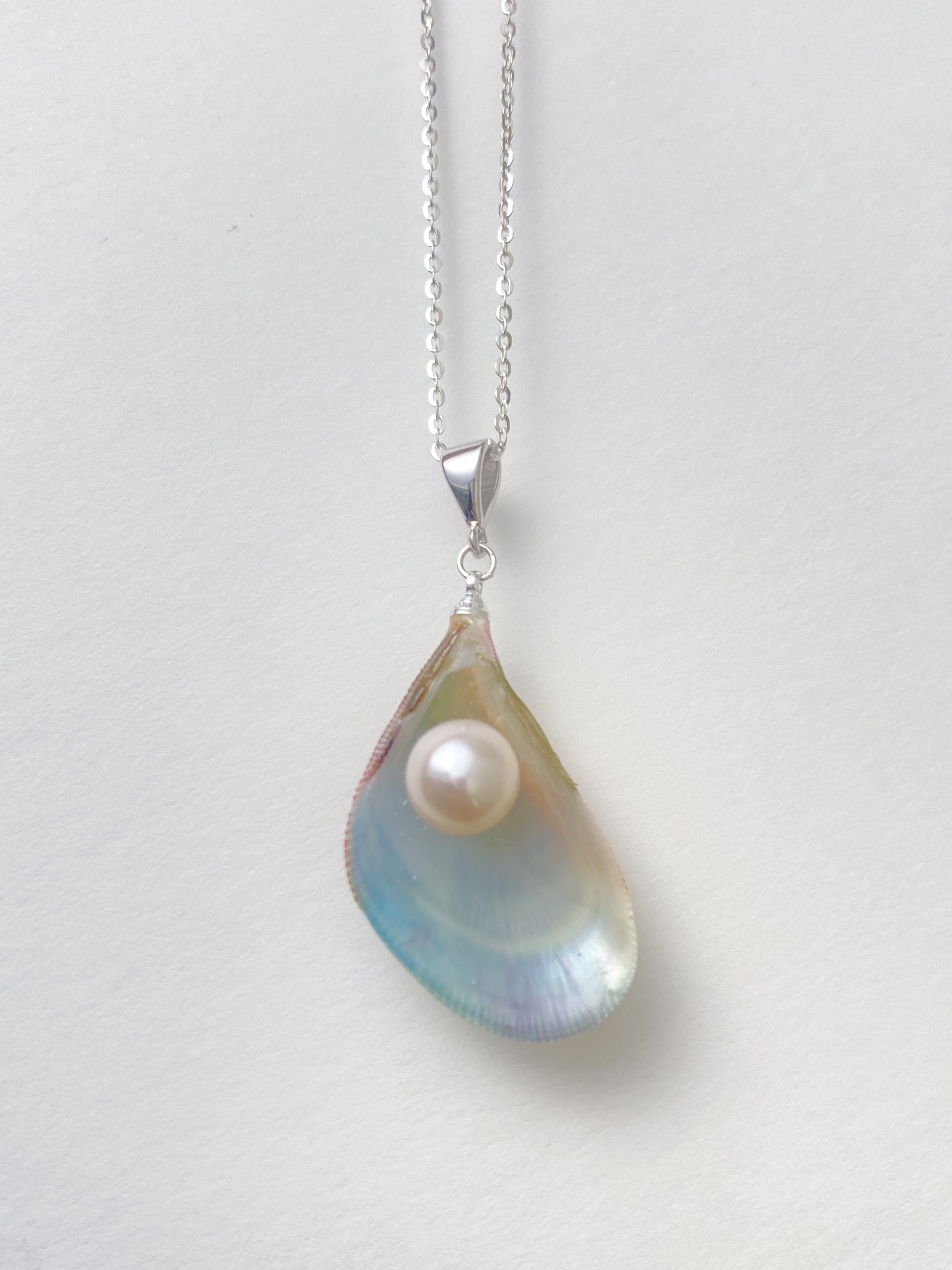 Our jewellery is Delicately handcrafted in our studio, Norwich. This necklace is crafted with the vivid colours of the rare Box Mussel shell, beautifully paired with a glowing freshwater pearl.